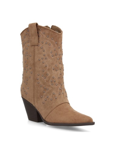 Bota cowboy para mujer con diseño de caña media con tachuelas metálicas. Punta fina y tacón cubano. Tirador lateral y cierre de cremallera. Ideal Otoño invierno.