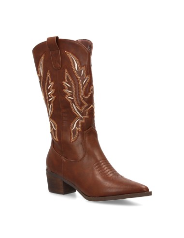 Bota cowboy de caña alta con bordados multicolor en la caña. Incluye punta fina y tacón ancho, cierre de cremallera, ideal para mujer, temporada otoño invierno.