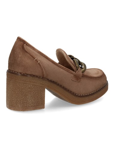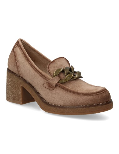 Mocasín de mujer con aterciopelado, tacón ancho de altura media, cadena metálica decorativa, suela de goma con plataforma ligera. Ideal otoño invierno.