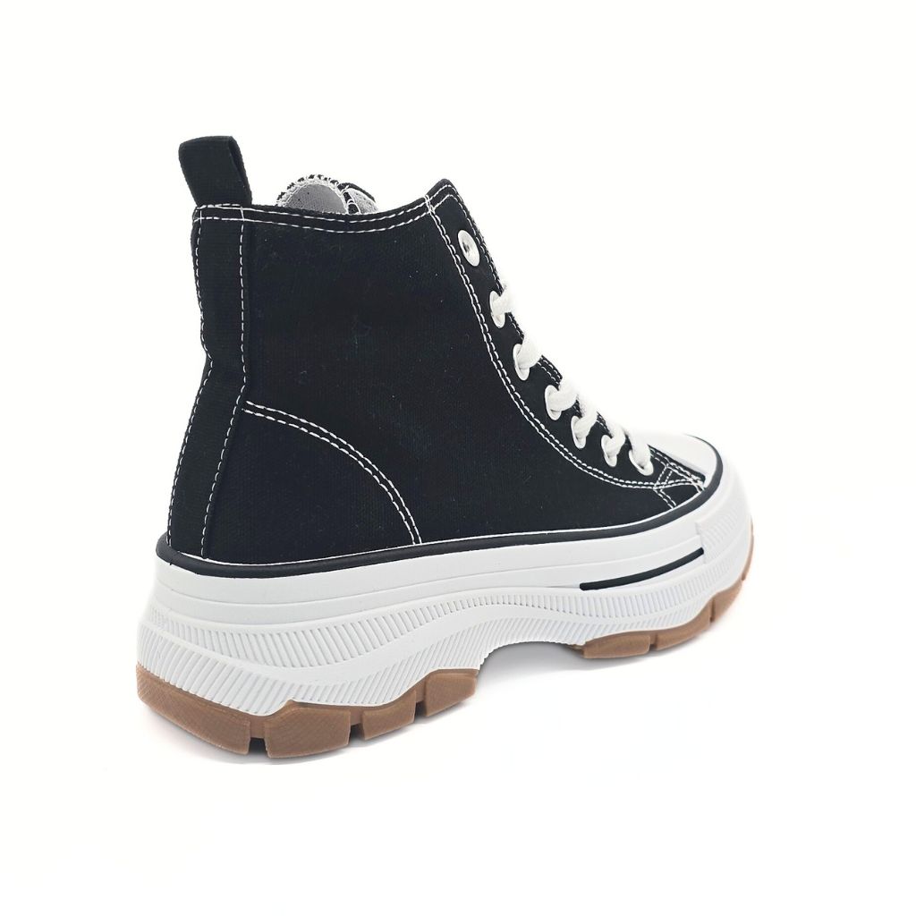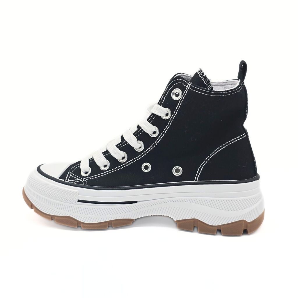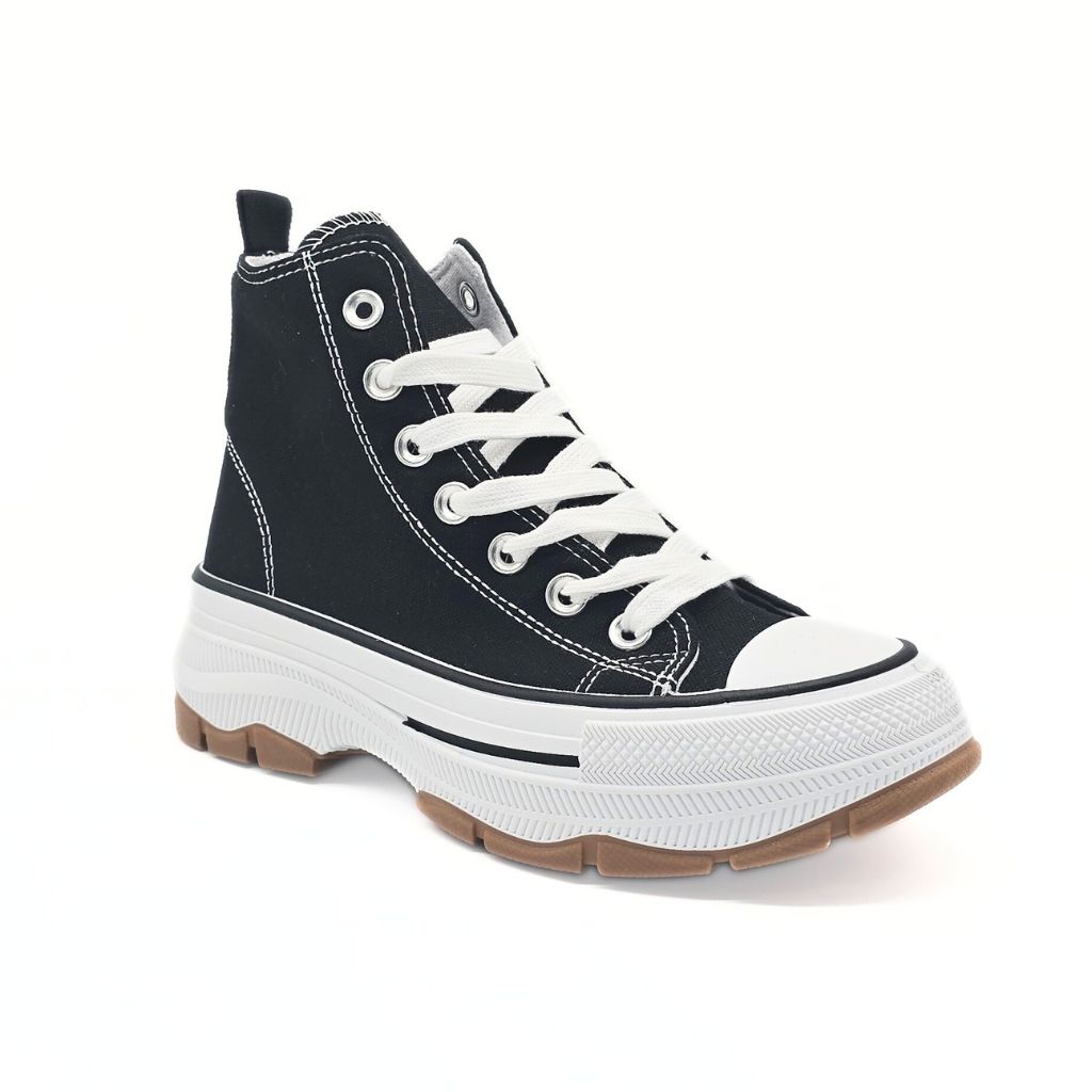 Estas zapatillas de lona altas en color negro combinan estilo y funcionalidad con una suela alta de 5 cm que aporta altura y comodidad. Su cierre de cordones garantiza un ajuste seguro, mientras que la puntera de goma ofrece protección y durabilidad. Ideales para quienes buscan un calzado versátil y resistente para el día a día.