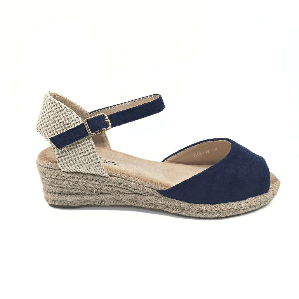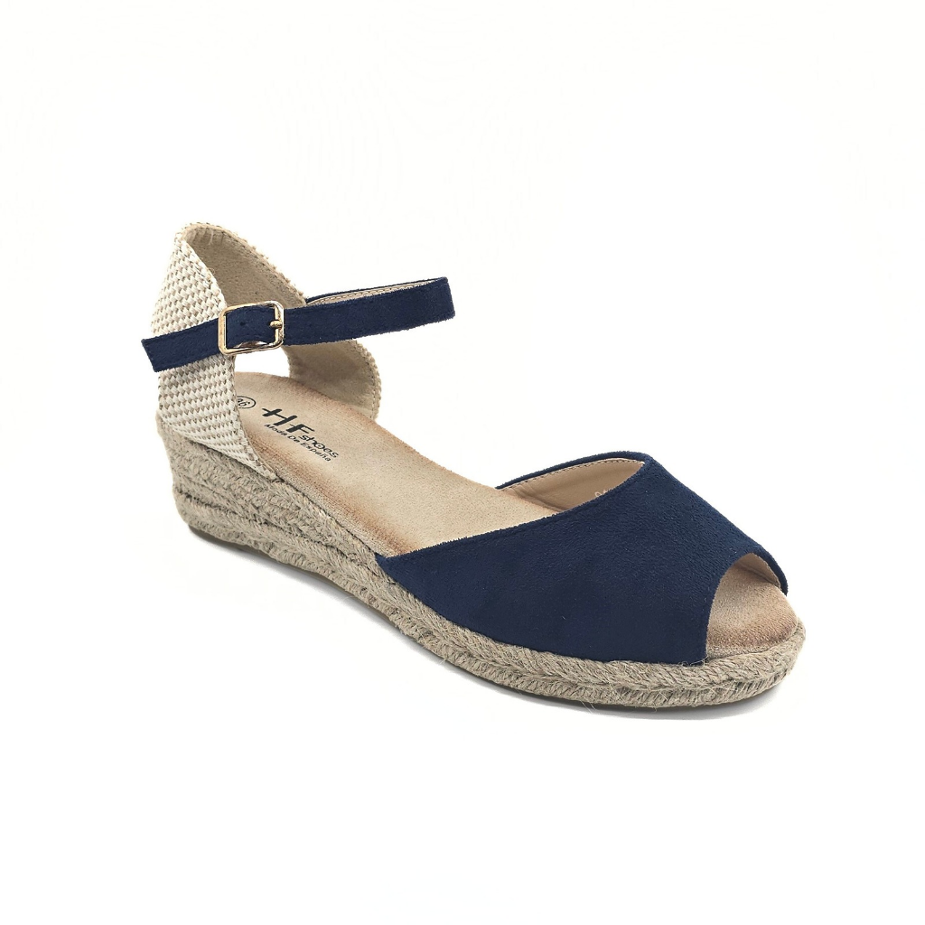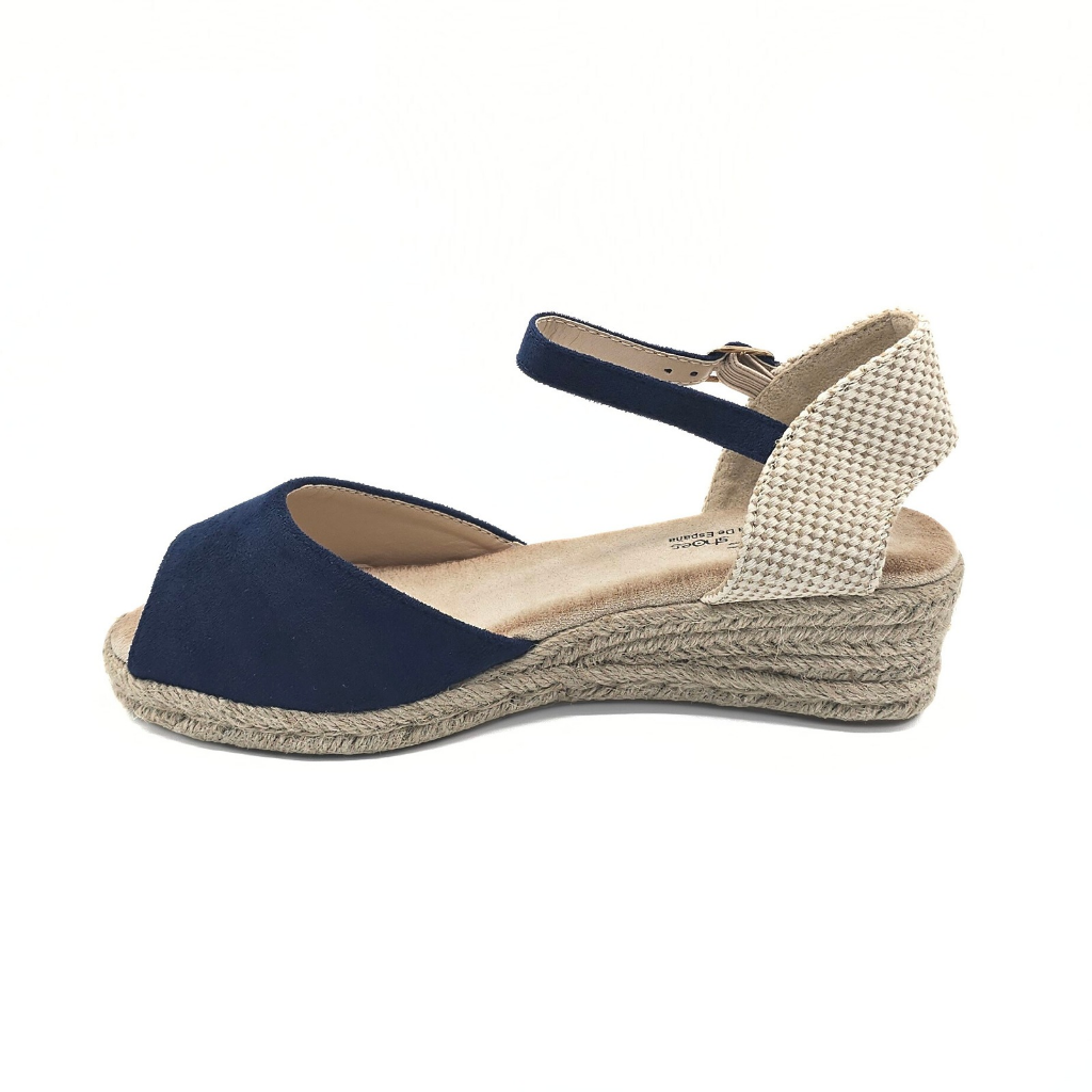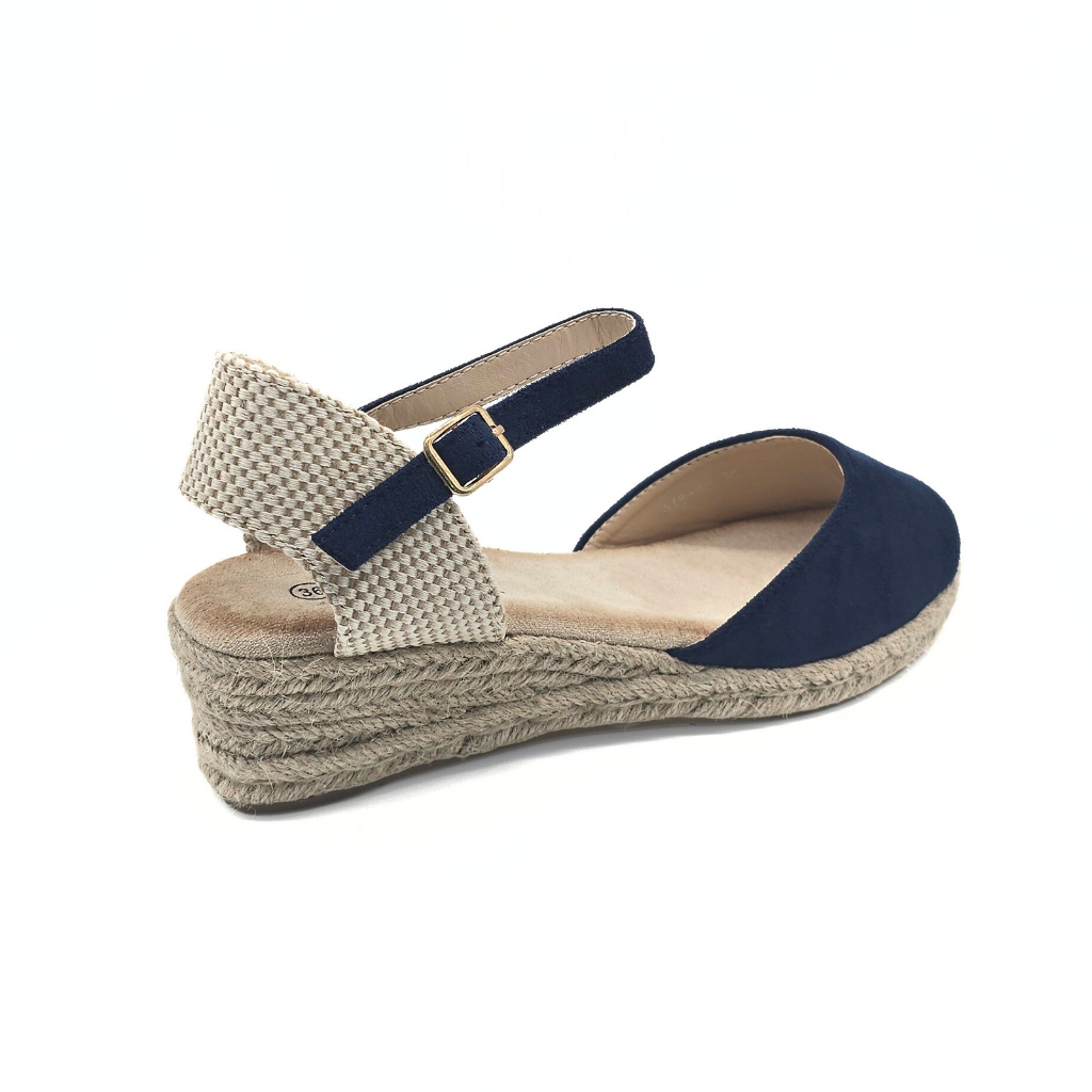 Cuña femenina en tono azul, diseñada con puntera abierta y cierre de pulsera ajustable mediante hebilla. Incorpora una plantilla de gel para mayor comodidad. Altura de la cuña: 5 cm en el talón y 2 cm en la parte delantera.