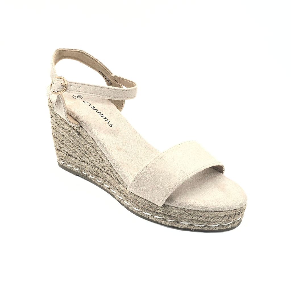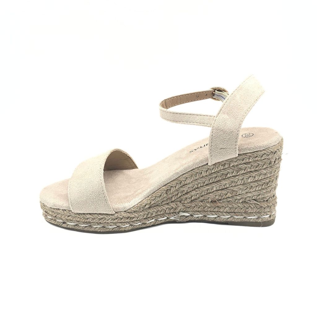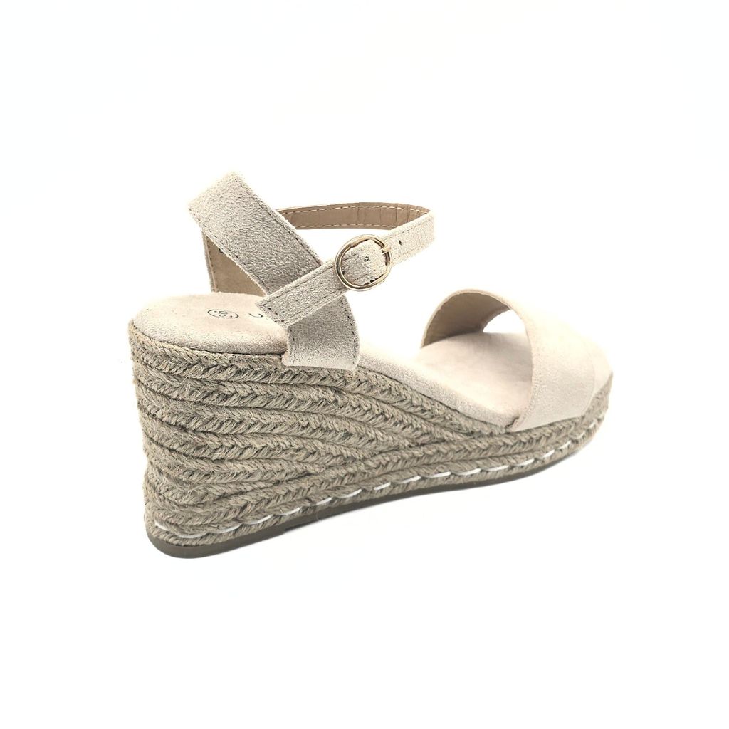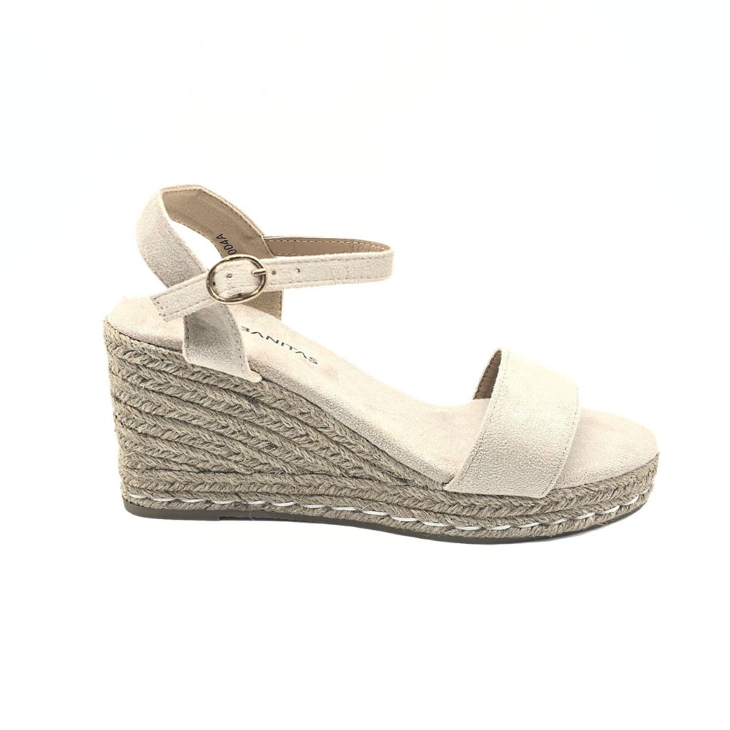 Cuña de esparto en tono beige con diseño de puntera abierta y cierre mediante hebilla. Altura total de 8,5 cm y plataforma de 3 cm para mayor comodidad.