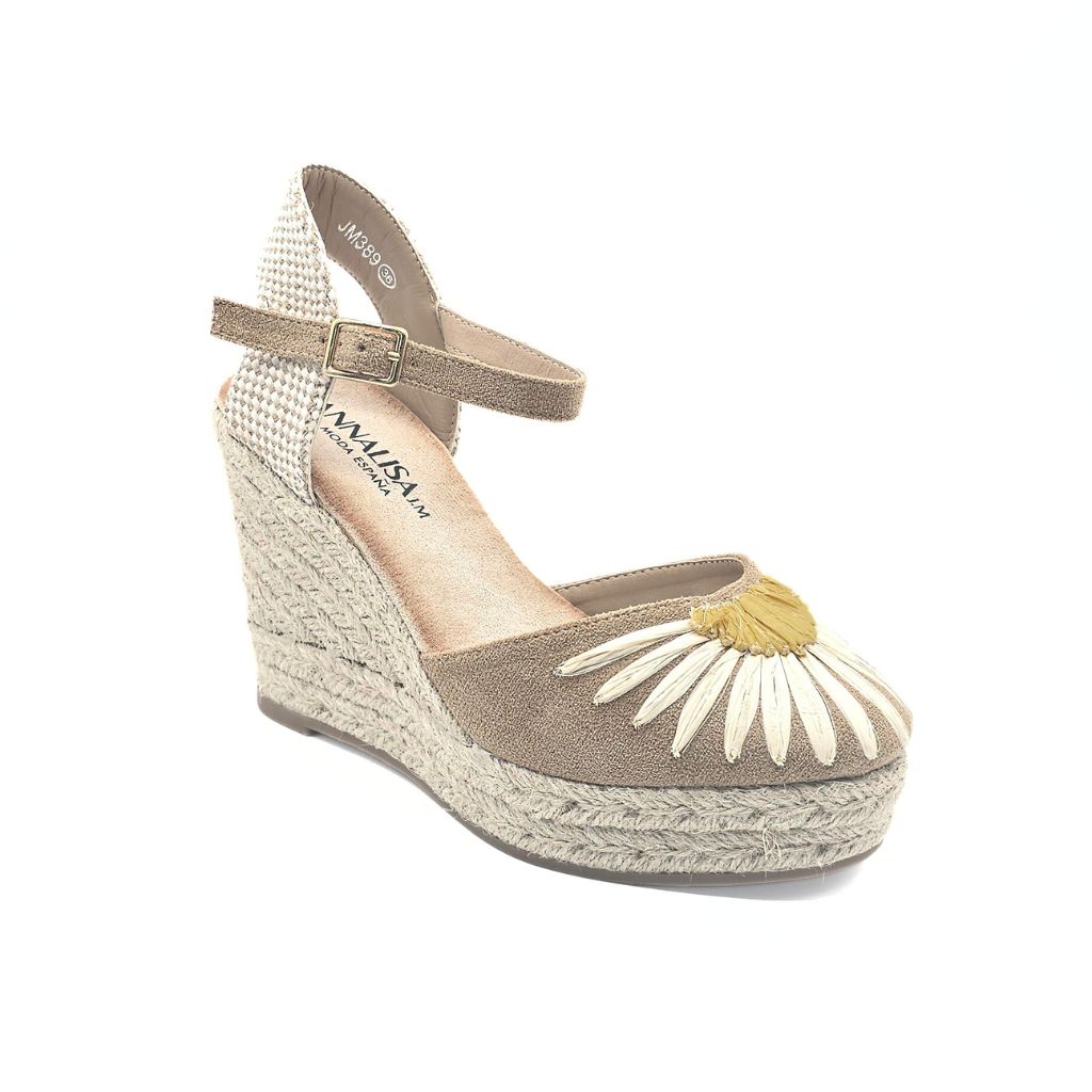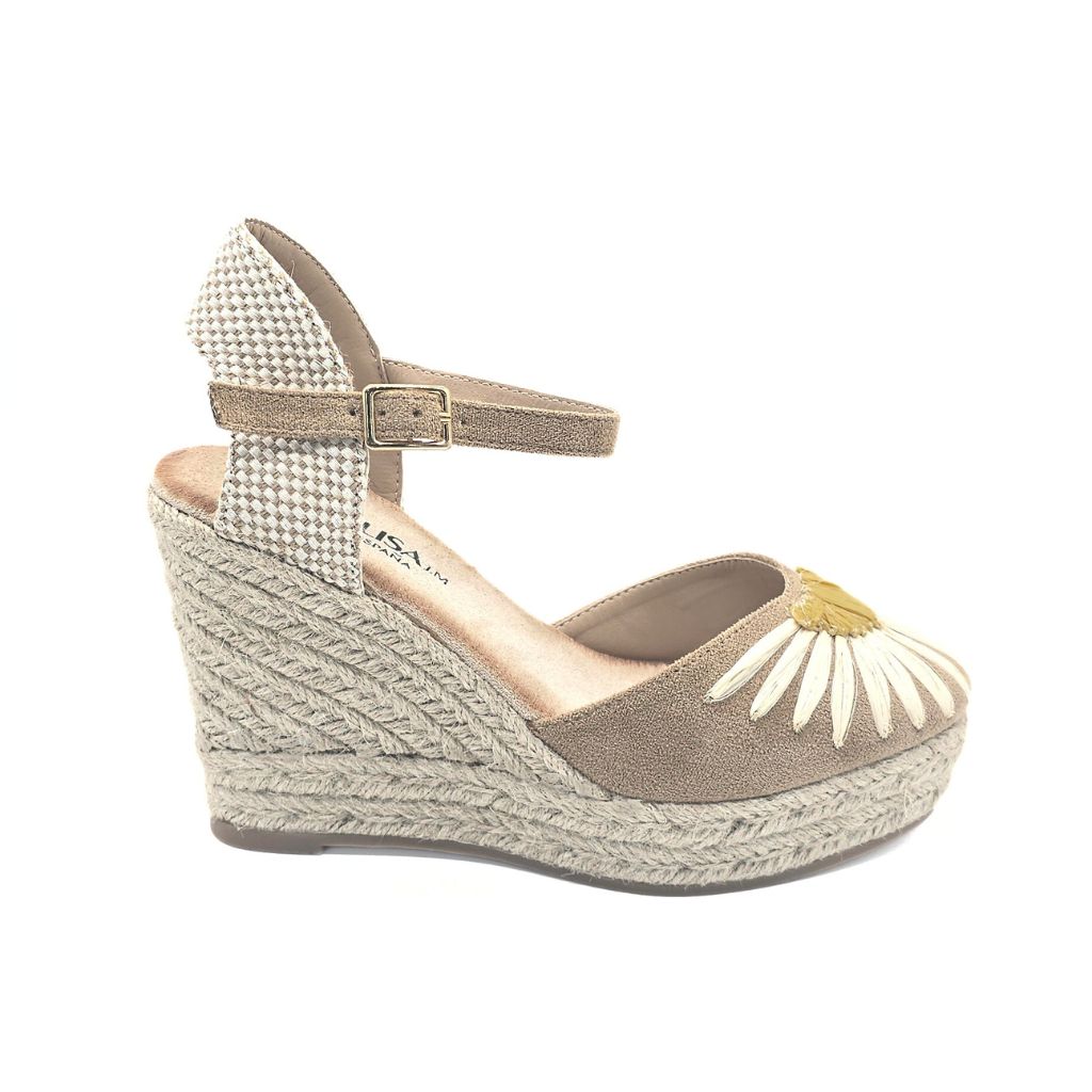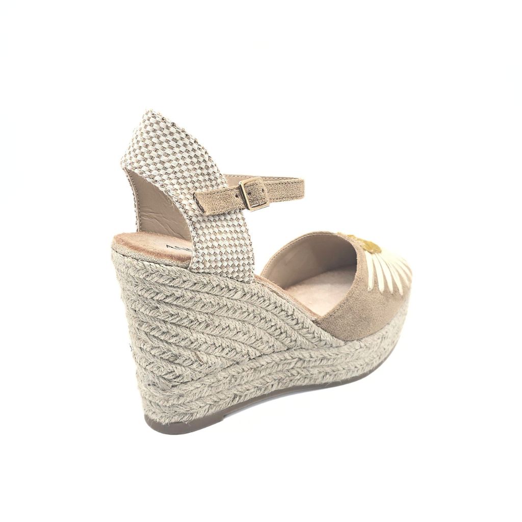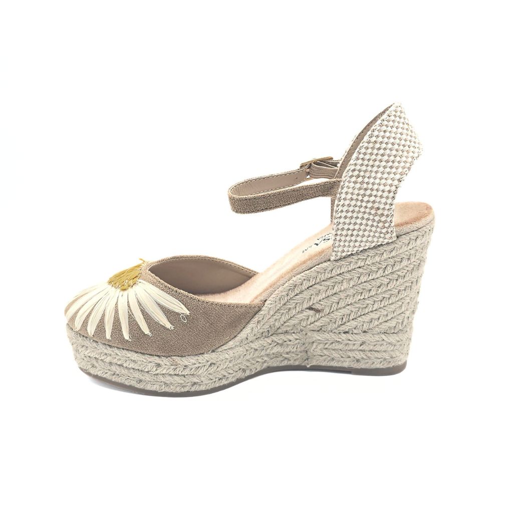 Cuña elevada en tono kaki con un adorno floral sobre el empeine, confeccionada en esparto. Altura total: 10 cm, plataforma: 3 cm.