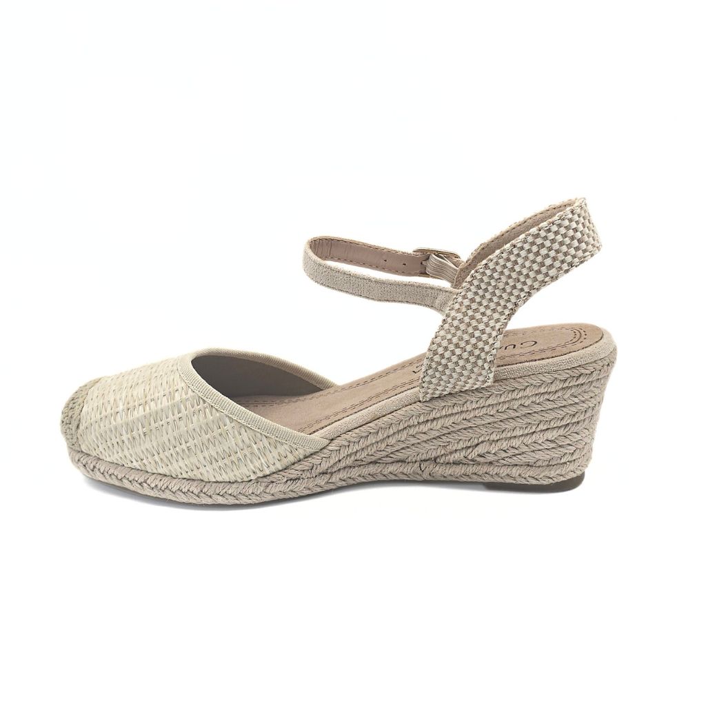 Esta sandalia de cuña presenta un cierre de pulsera con hebilla que asegura un ajuste firme y cómodo. Su empeine de rafia aporta un toque natural y elegante, mientras que la puntera cerrada ofrece protección y estilo. Con una altura de cuña de 6,5 cm, combina elevación y estabilidad para un uso prolongado con sofisticación.