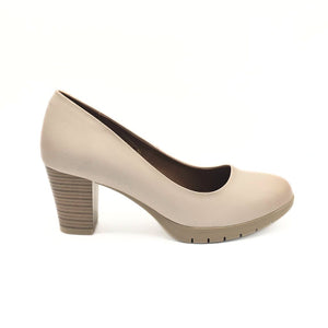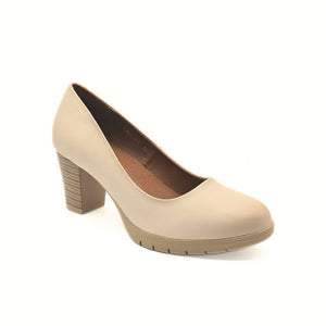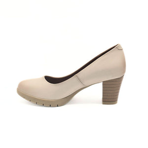 Este zapato de salón en color beige combina elegancia y comodidad gracias a su tacón ancho de 6,5 cm, que proporciona estabilidad y soporte durante todo el día. La suela de goma garantiza un buen agarre, ideal para un uso prolongado en diferentes superficies. Perfecto para complementar tanto looks formales como casuales con un toque sofisticado.