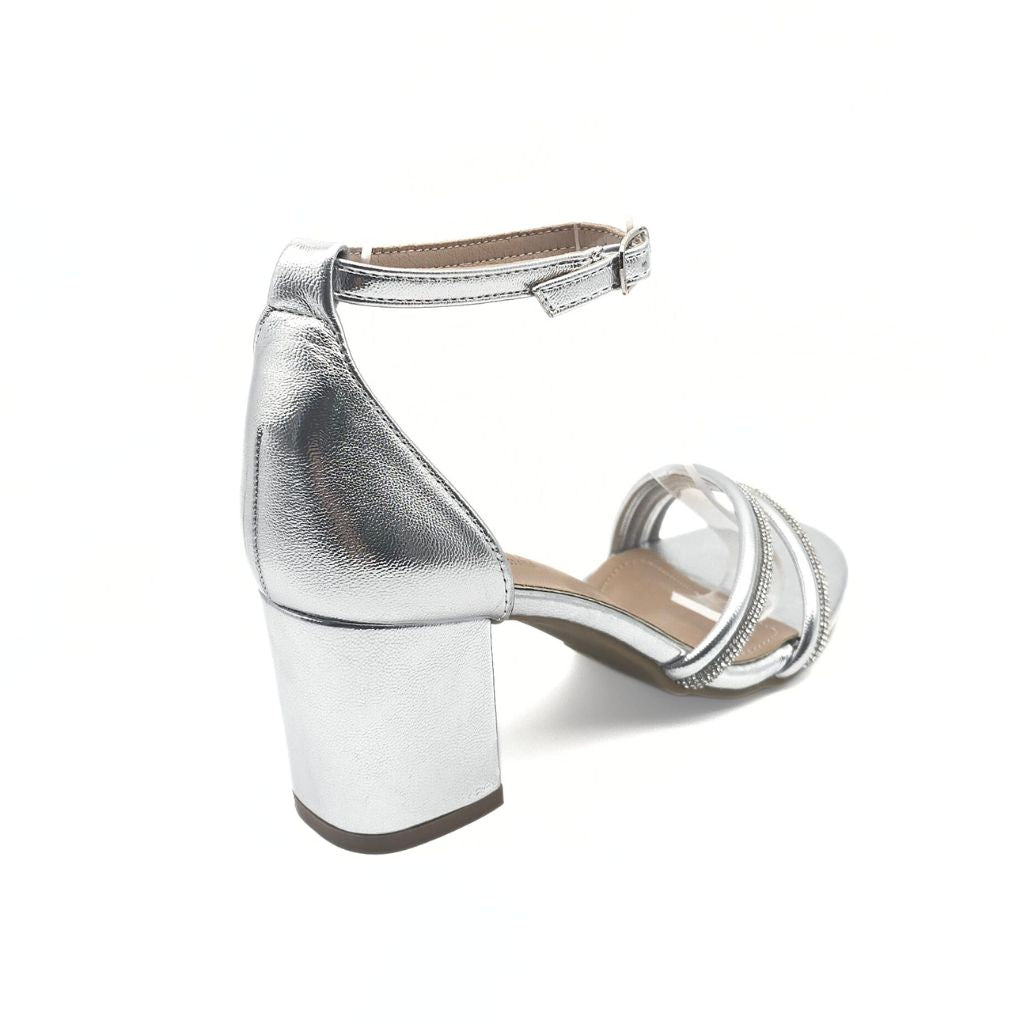 Esta sandalia de tacón ancho en color plata combina elegancia y comodidad, ideal para ocasiones especiales. Su diseño incluye brillantes en la zona del empeine que aportan un toque sofisticado y luminoso. El cierre de hebilla garantiza un ajuste seguro y personalizado. Con una altura de tacón de 6,5 cm, ofrece una elevación cómoda que favorece la postura sin sacrificar estabilidad. Perfecta para quienes buscan estilo y funcionalidad en un solo calzado.