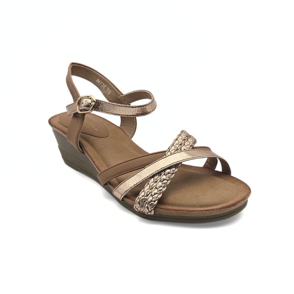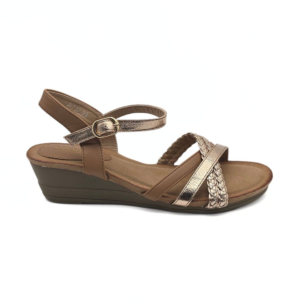 Esta sandalia con cuña en color camel combina comodidad y estilo gracias a su plantilla de gel que ofrece amortiguación y soporte. Las tiras cruzadas en el empeine en tono bronce aportan un detalle elegante y sofisticado, mientras que el cierre de hebilla garantiza un ajuste seguro. Con una altura de cuña de 5 cm, proporciona elevación sin sacrificar estabilidad.
