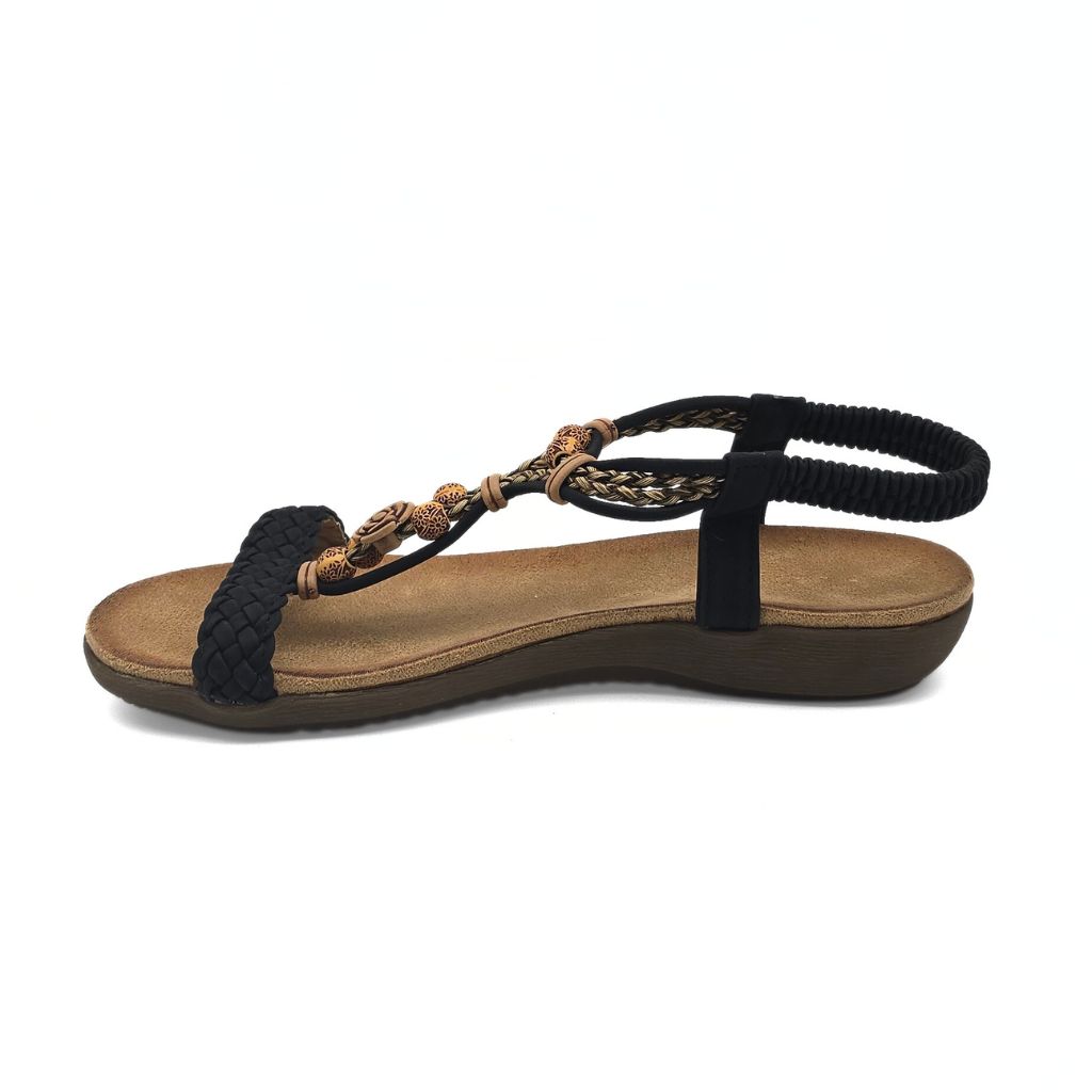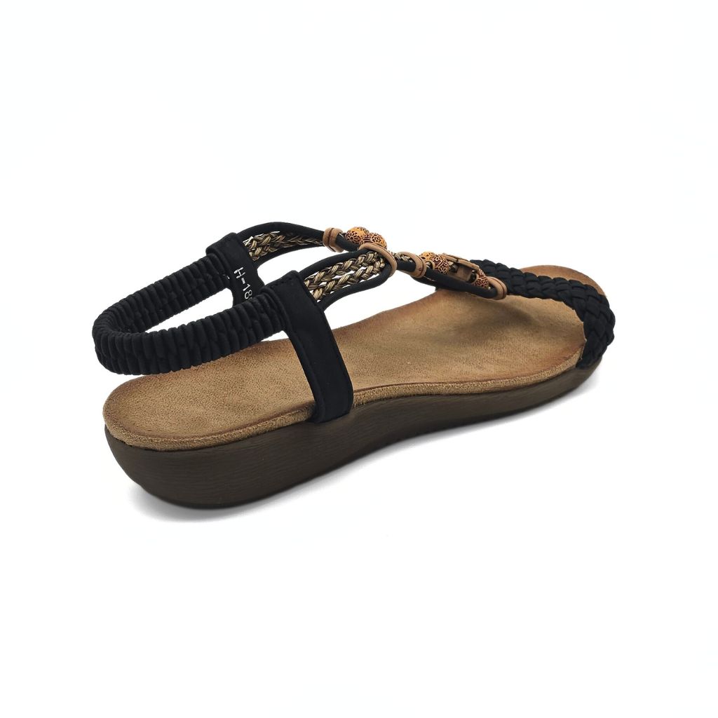 Esta sandalia plana con elástico ofrece un ajuste cómodo y seguro. Su empeine presenta detalles trenzados junto con una delicada flor, aportando un toque artesanal y elegante que realza cualquier conjunto con sutileza y estilo.