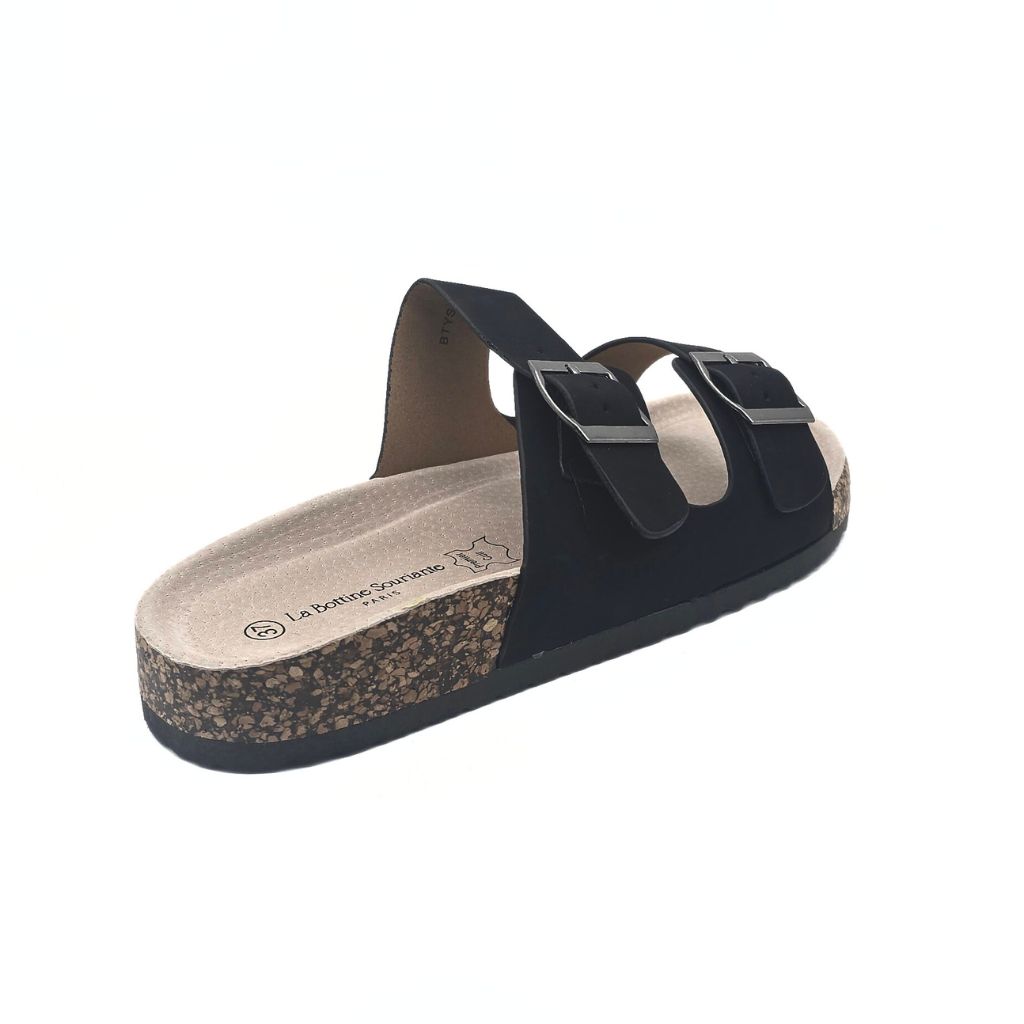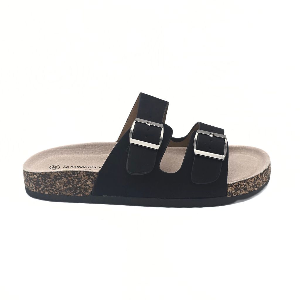 Estas sandalias planas tipo mule en color negro cuentan con doble hebilla que permite un ajuste personalizado y seguro. La plantilla de piel garantiza una sensación de confort y transpirabilidad, combinando funcionalidad y estilo en un diseño versátil ideal para el uso diario.