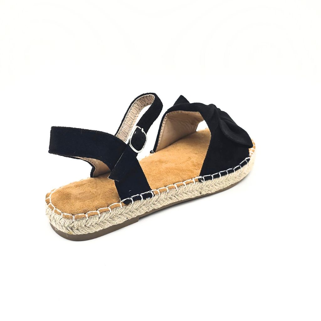 Sandalia plana en color negro, equipada con cierre de pulsera con hebilla y detalle de lazo sobre el empeine. Cuenta con plantilla de gel para mayor comodidad. Material sintético.
