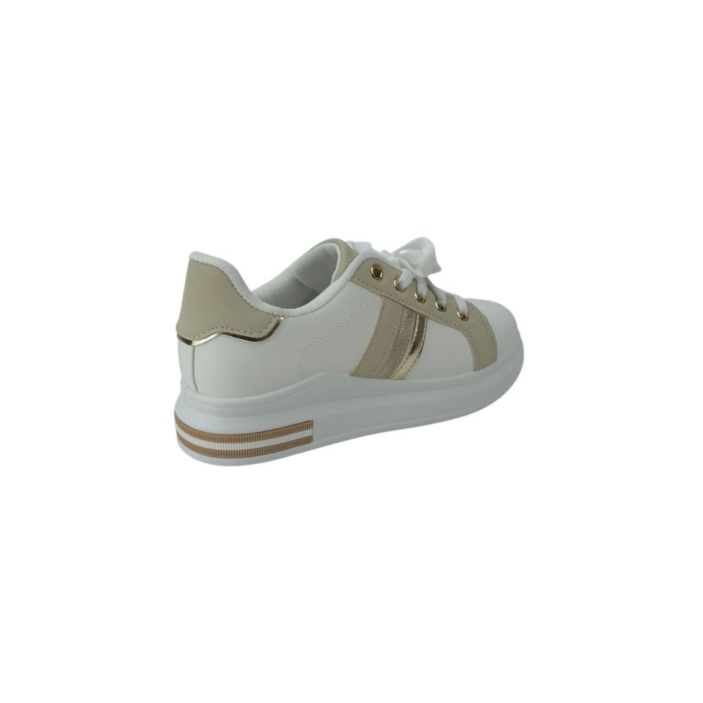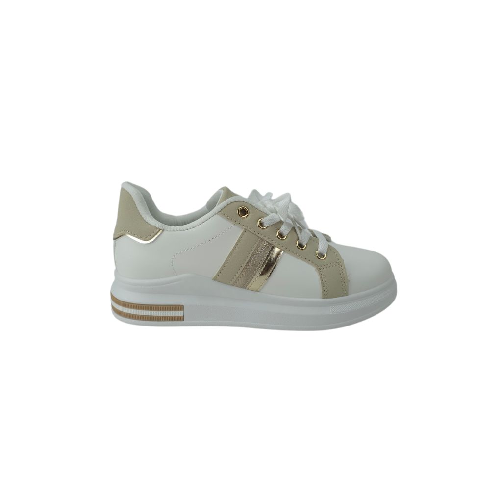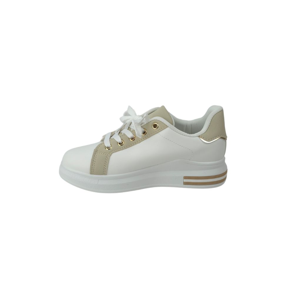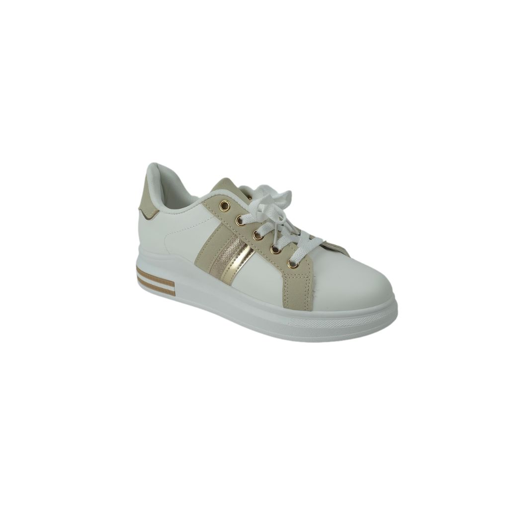 Presentamos unas elegantes zapatillas blancas y beige, diseñada para quienes buscan un estilo moderno y sofisticado. Su distintiva franja dorada añade un toque de lujo, mientras que la base blanca proporciona versatilidad y comodidad. Ideal para complementar tanto atuendos casuales como más formales, esta zapatilla es una opción perfecta para cualquier ocasión.