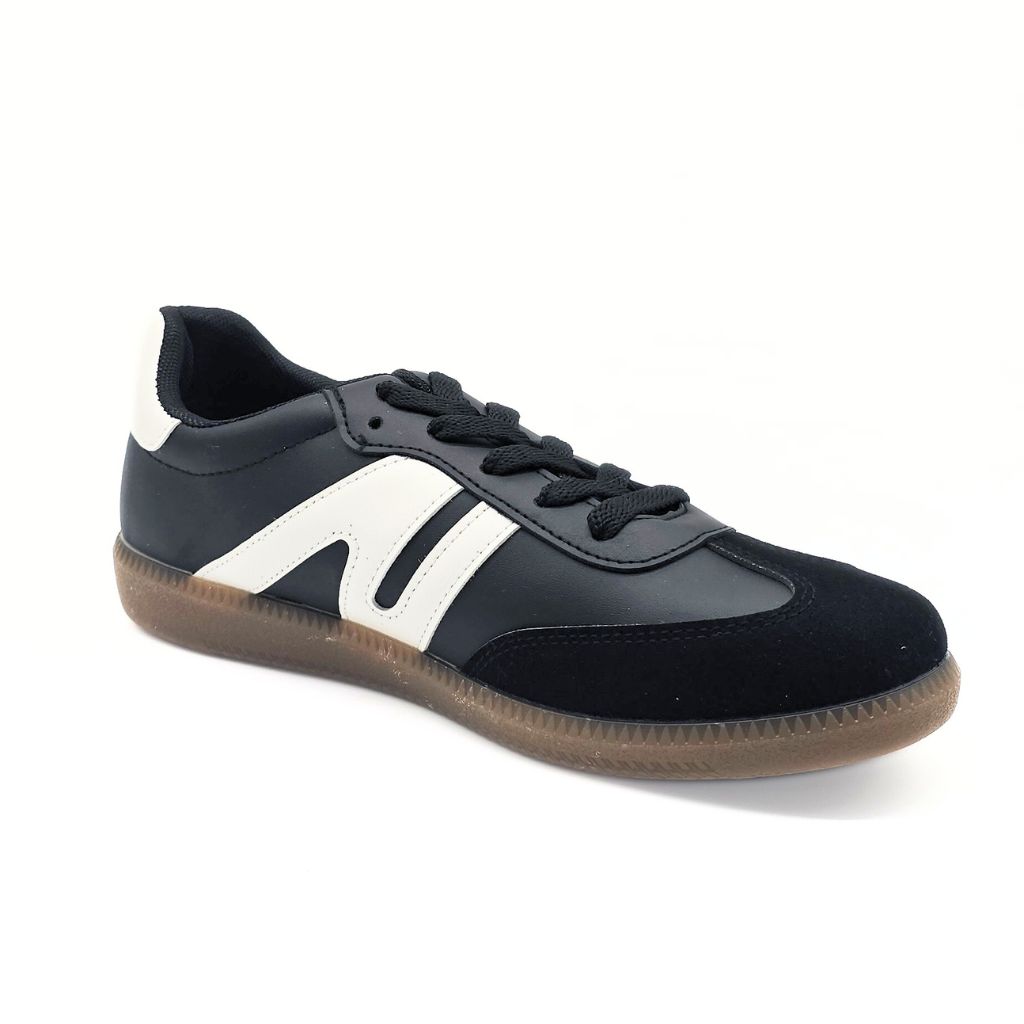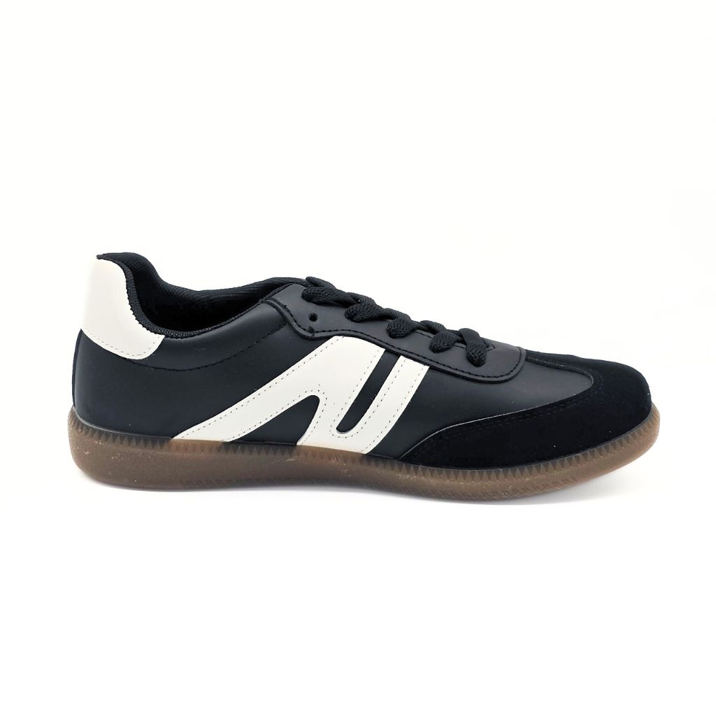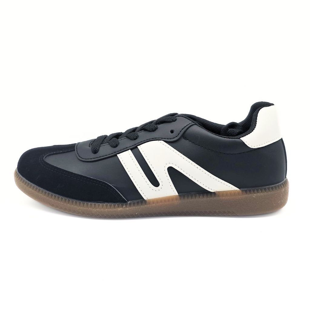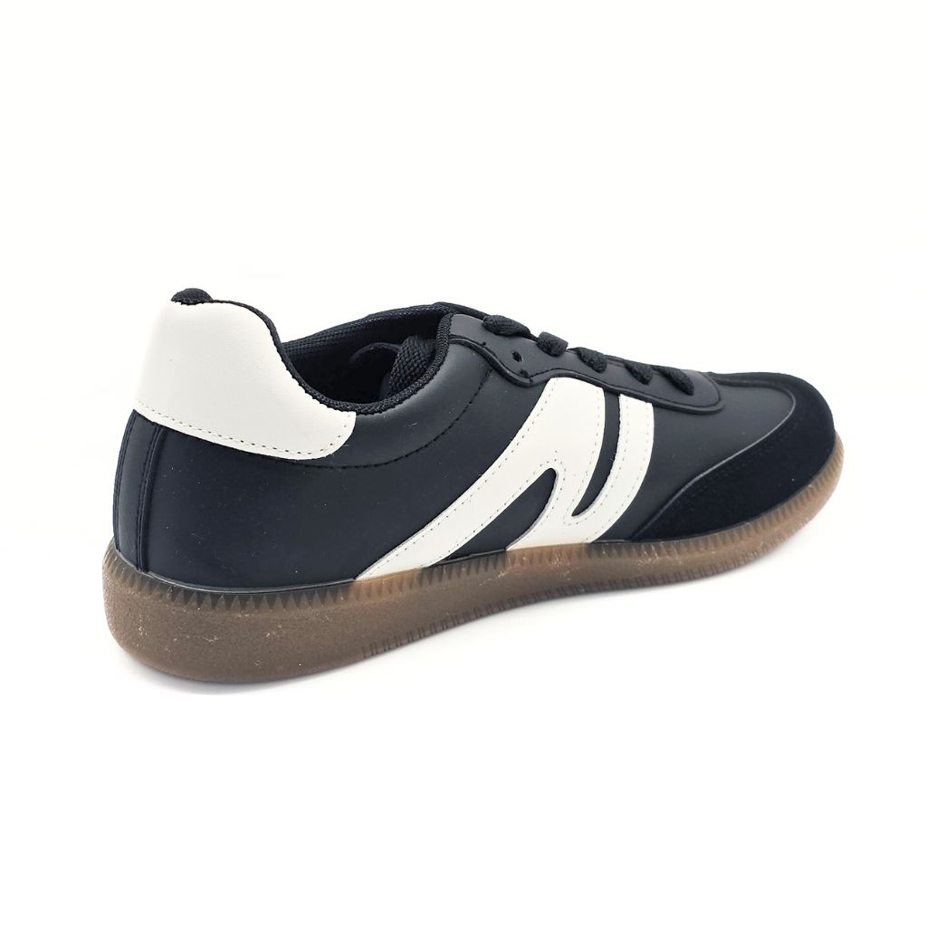 Zapatillas deportivas masculinas en elegante color negro con distintivo detalle en blanco. Incorporan suela de goma que proporciona tracción óptima y durabilidad superior. El sistema de cierre mediante cordones garantiza un ajuste personalizado y seguro. Diseño versátil ideal para uso diario.